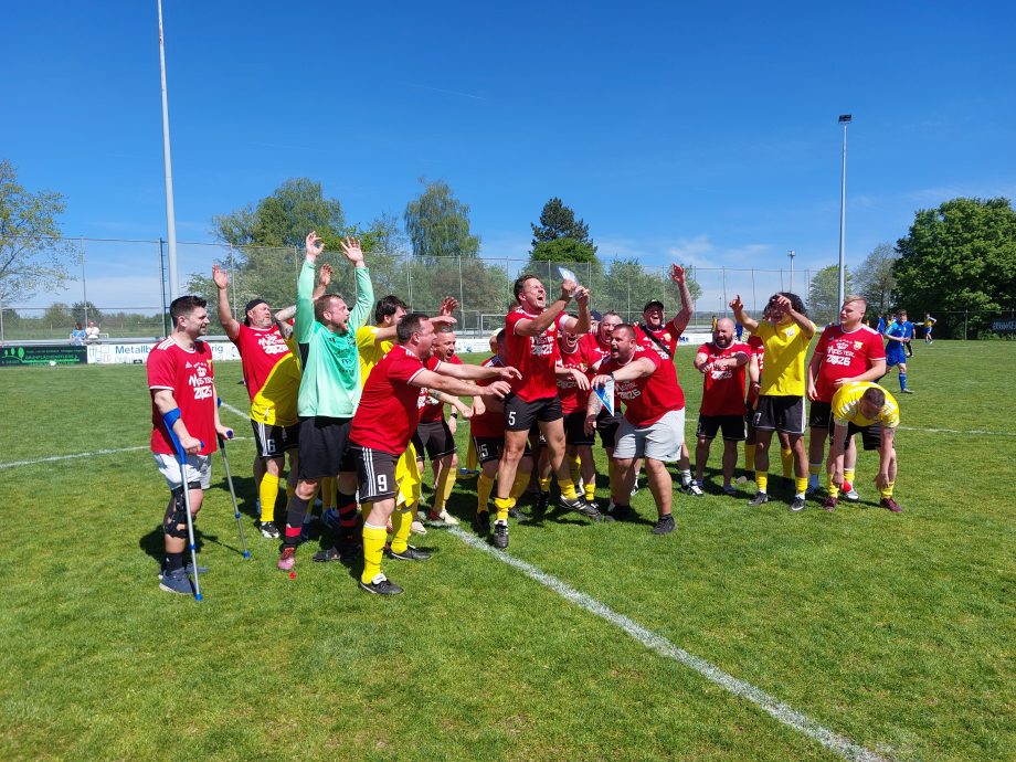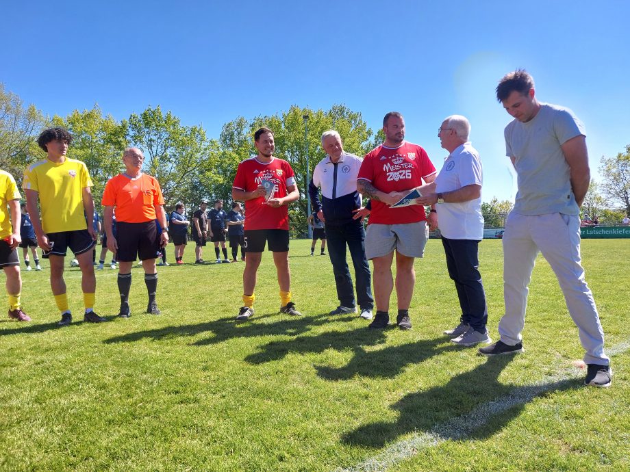 Am vergangenen Sonntag war es endlich soweit: Unsere 2. Mannschaft bekam in Person von Manfred Emrich und Hans Josef Westrich vom Saarländischen Fußballverband nach der errungenen Meisterschaft in der Kreisliga B Neunkirchen die „Schale“ überreicht. Unserem Team gelang es, alle Spiele der Saison zu gewinnen. Auch Emrich betonte: „Ich habe bereits einige Trophäen übergeben, aber dass ein Team verlustpunktfrei Meister wird, ist für mich auch neu.“ Umso größer war die Freude, als Kapitän Waldemar Bauer die hübsche Trophäe in die Höhe stemmen konnte. Geehrt wurde Tobias Andes, der einen Wimpel des SFV erhielt. Westrich dankte ihm ausdrücklich für sein großes Engagement auf und neben dem Platz. Wir sind stolz auf dieses Team und sagen auch noch einmal Herzlichen Glückwunsch zum Titel in der Saison 2025/26! Beim 4:2-Sieg gegen den SV Kohlhof trafen Mirko Holzmayr, Felix Scherer und Victor Bialecki. Die Gäste steuerten ein Eigentor bei.